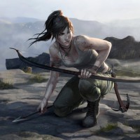 a female character kneeling on what appears to be the edge of a cliff or a high ledge. She is holding two bows with arrows attached, one in each hand. Her attire includes a backpack and she has her hair tied up. The background suggests a rocky outdoor environment that could be part of
