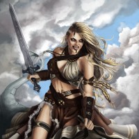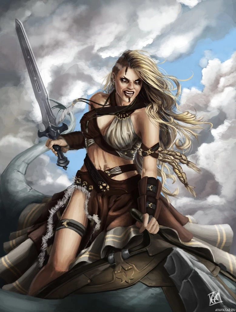 a female character who appears to be a warrior or an adventurer. She has long, wavy