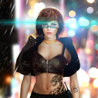 dark clothing, including leather pants, a jacket with a hood that seems to have a fur-like texture, and boots. The person is also holding what appears to be a pair of sunglasses in their right hand. The background features