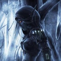 a menacing look. They are holding what seems to be a sword or a weapon, and the overall atmosphere suggests a scene from a fantasy or role-playing