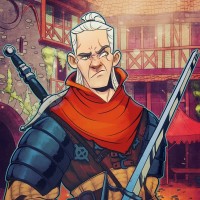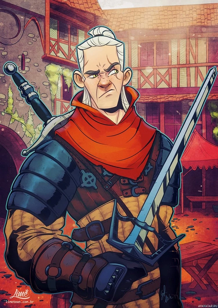 Geralt of Rivia, and he appears to be a professional monster hunter known for his expert swordsmanship and ability to cast magic spells. In this depiction, Geralt is wearing armor and carrying