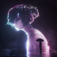 a body of water that resembles a pool or puddle. The artwork has a futuristic feel, characterized by