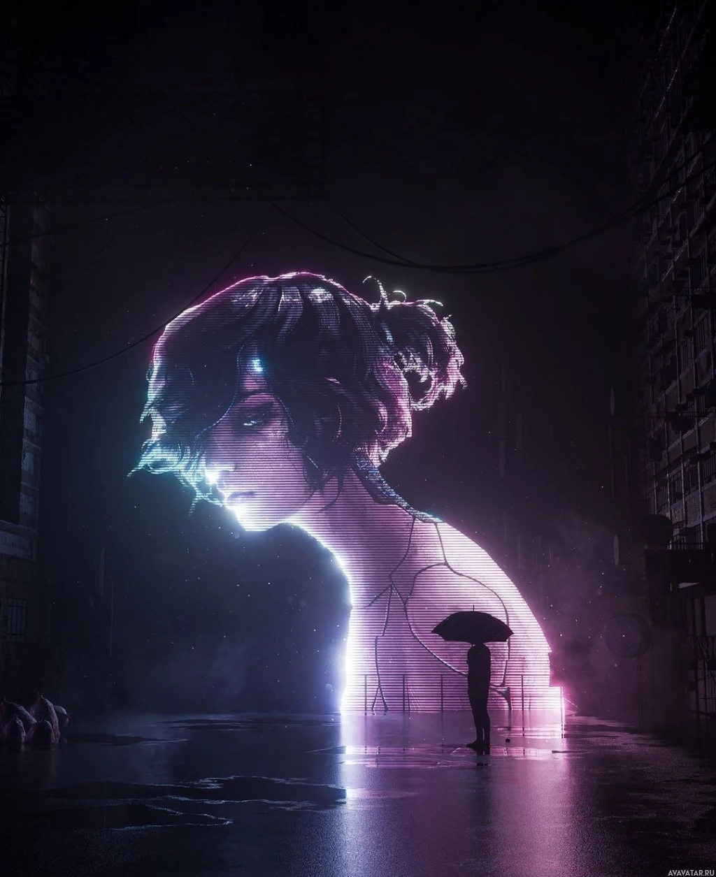 an urban environment that appears to be at night. Her profile is prominently displayed in the foreground, while her full face can be seen on her reflection in