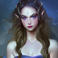 female character with fantasy-themed features. She has pointed ears, which suggests that she is meant to be an elf from