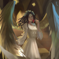an illustrated character, a female angel with wings and a halo. She is wearing