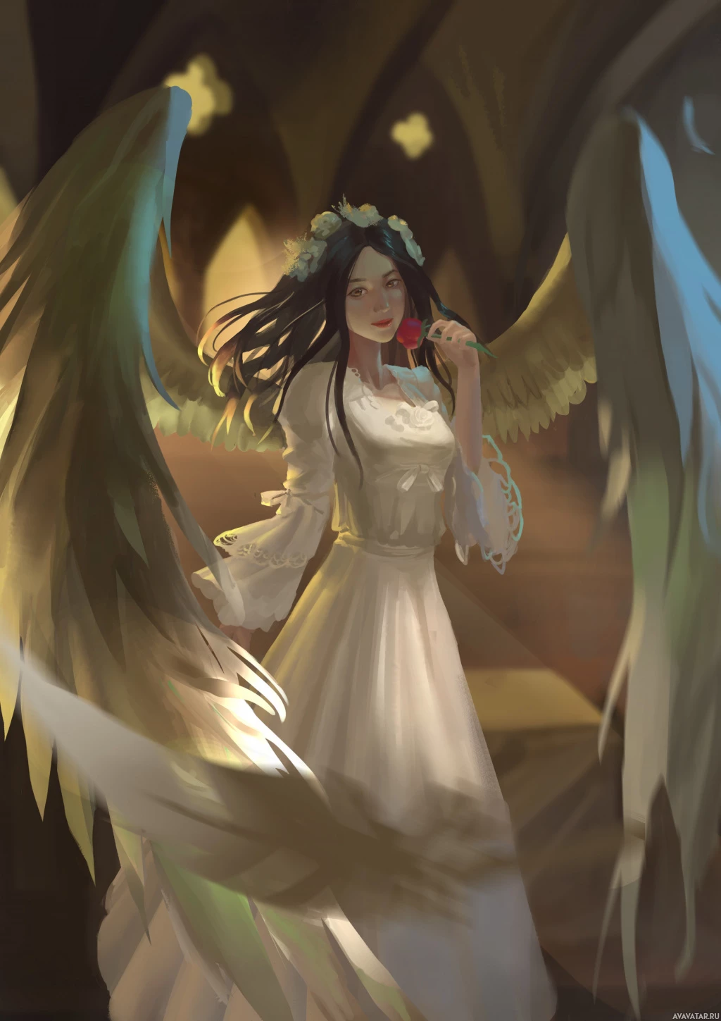 a white dress with puffed sleeves and has black hair adorned with what appears to be a headband or garland of flowers. In her hand, she holds a flower, possibly a rose. The background suggests