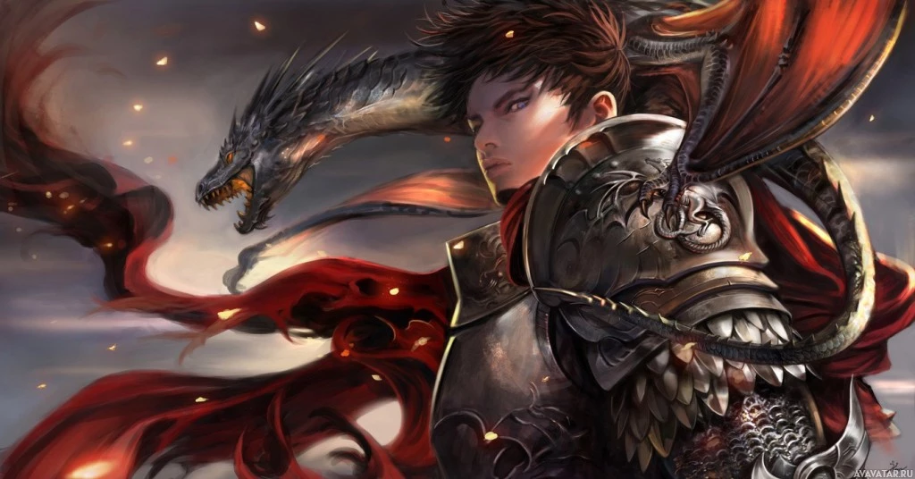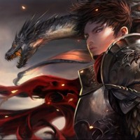 a fantasy scene featuring an armored knight facing off against a dragon. The knight is standing on the ground, wearing detailed armor and holding a weapon that appears to be a sword or spear with a shield. The dragon is positioned above the knight, displaying wings and