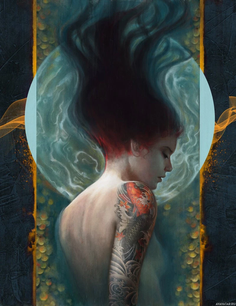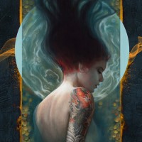 flowing hair. She has tattoos on her arm and appears to be gazing into the distance with a contemplative or introspective expression. Behind her is an abstract representation of a landscape, possibly representing water and sky, set within a circular frame that seems to radiate outward from her head, giving the impression that she is in a mystical or otherworldly