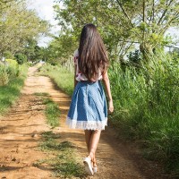 casual attire, including a light-colored top and denim skirt with frills at the bottom, and white shoes. They have long