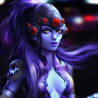 The image features a character known as Widowmaker from the video game "Overwatch." She is depicted in her typical attire, which includes purple hair and a distinctive face mask that she wears during gameplay. Her pose suggests she is ready for action or posing for a photo.