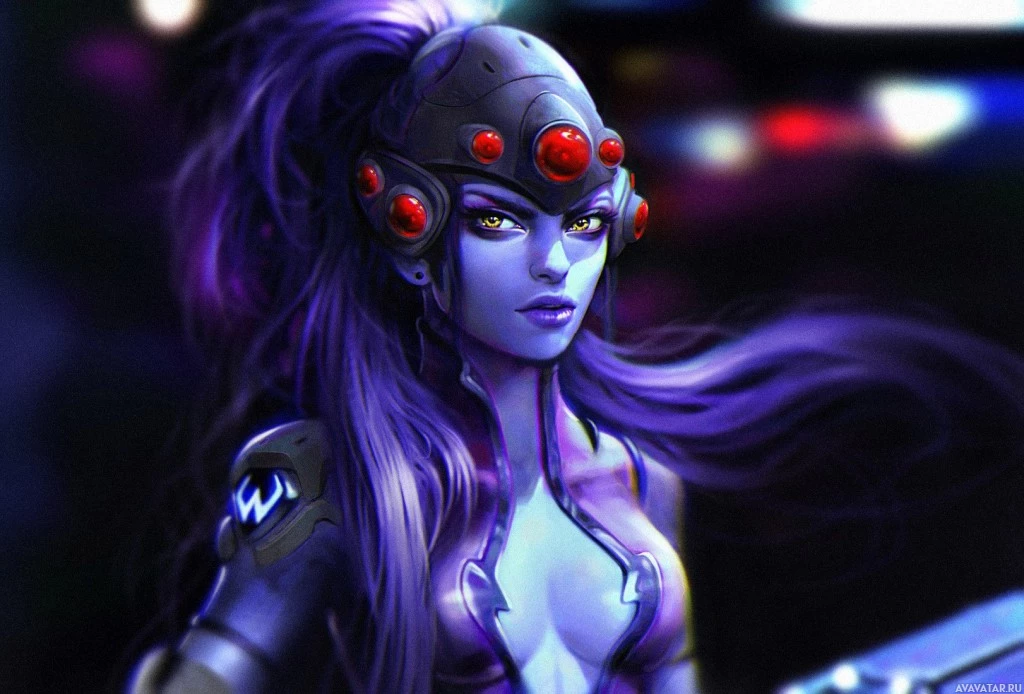 На картинке изображен персонаж, известный как Вдоводел из видеоигры «Overwatch». Она изображена в своем типичном наряде, который включает фиолетовые волосы и отличительную маску для лица, которую она носит во время игрового процесса. Ее поза предполагает, что она готова к действию или позирует для фотографии.