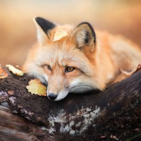 a relaxed position, and there are autumn-colored leaves scattered around it.