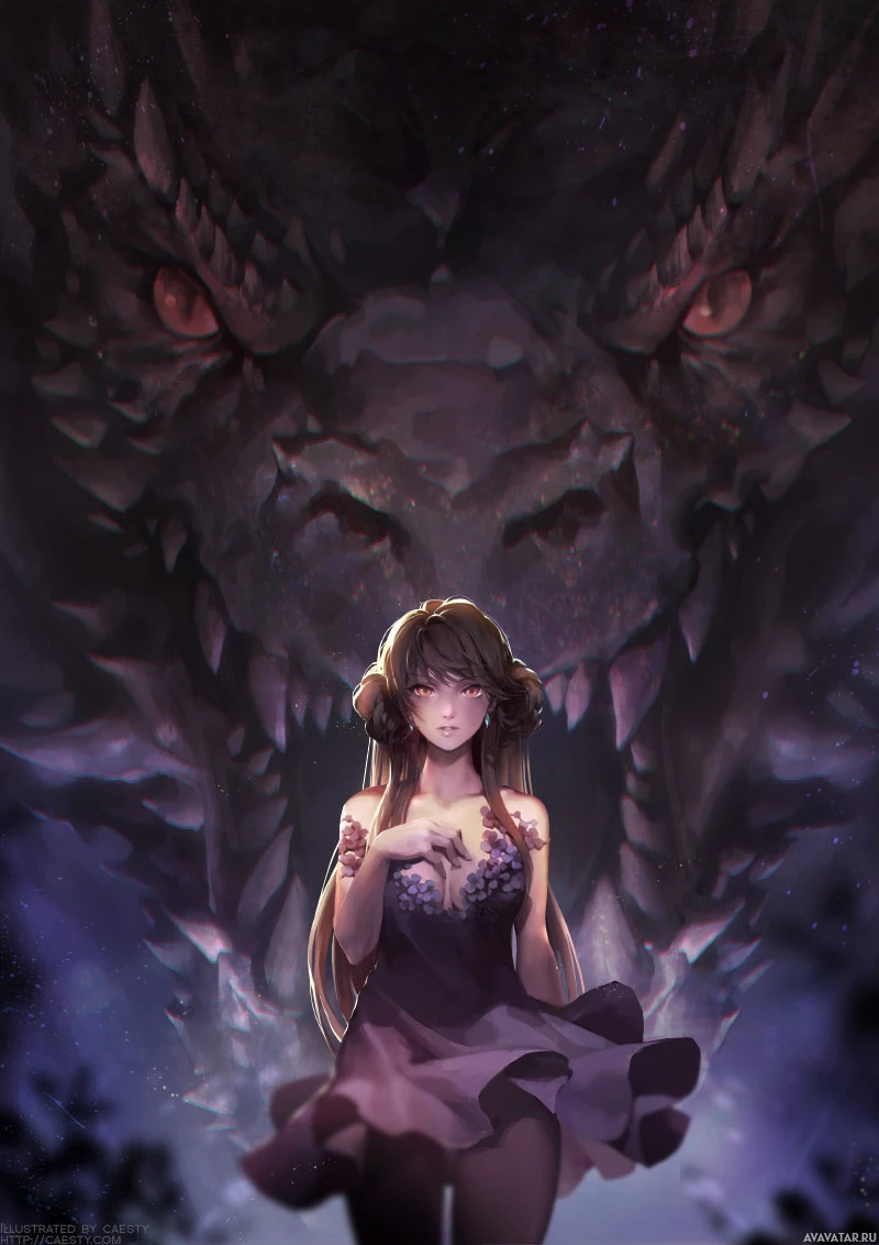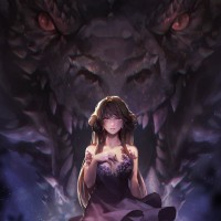 a fantasy scene with an animated character, a girl, standing in front of a large dragon. The girl is smiling and appears to be interacting with the dragon, which has its mouth open as if it's roaring or speaking. The background suggests a nighttime setting with