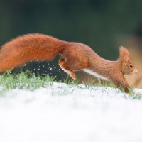 The picture shows a red squirrel running across what appears to be snow-covered ground. It's an outdoor scene with the squirrel being the main subject in the image, and it seems like it could be either early morning or late afternoon due to the soft lighting.