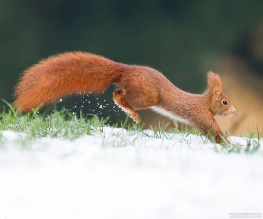 На картине изображена красная белка, бегущая по заснеженной земле. Это наружная сцена с белкой, которая является основной темой на изображении, и, похоже, это может быть либо рано утром, либо поздно вечером из-за мягкого освещения.