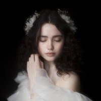 brunette hair and is wearing what appears to be a white bridal gown with ruffled sleeves. There are flowers adorning her dress, adding to the ethereal quality of the photo. The background is dark, which contrasts with the light-colored dress and emphasizes her presence in the image.