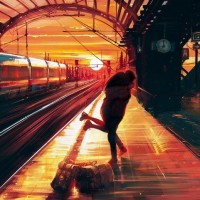 a silhouette of a person at a train station, bending over and reaching down to pick up their bag. This scene is set against a vibrant sunset with