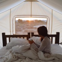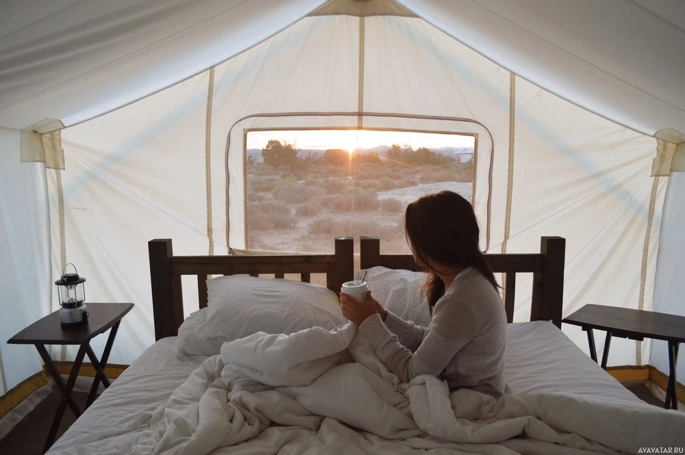 a cup of tea or coffee. There's a tent-like structure outside the window, suggesting she might be in a temporary lodging arrangement, possibly camping or glamping (glamorous camping). The sky is colored with hues of
