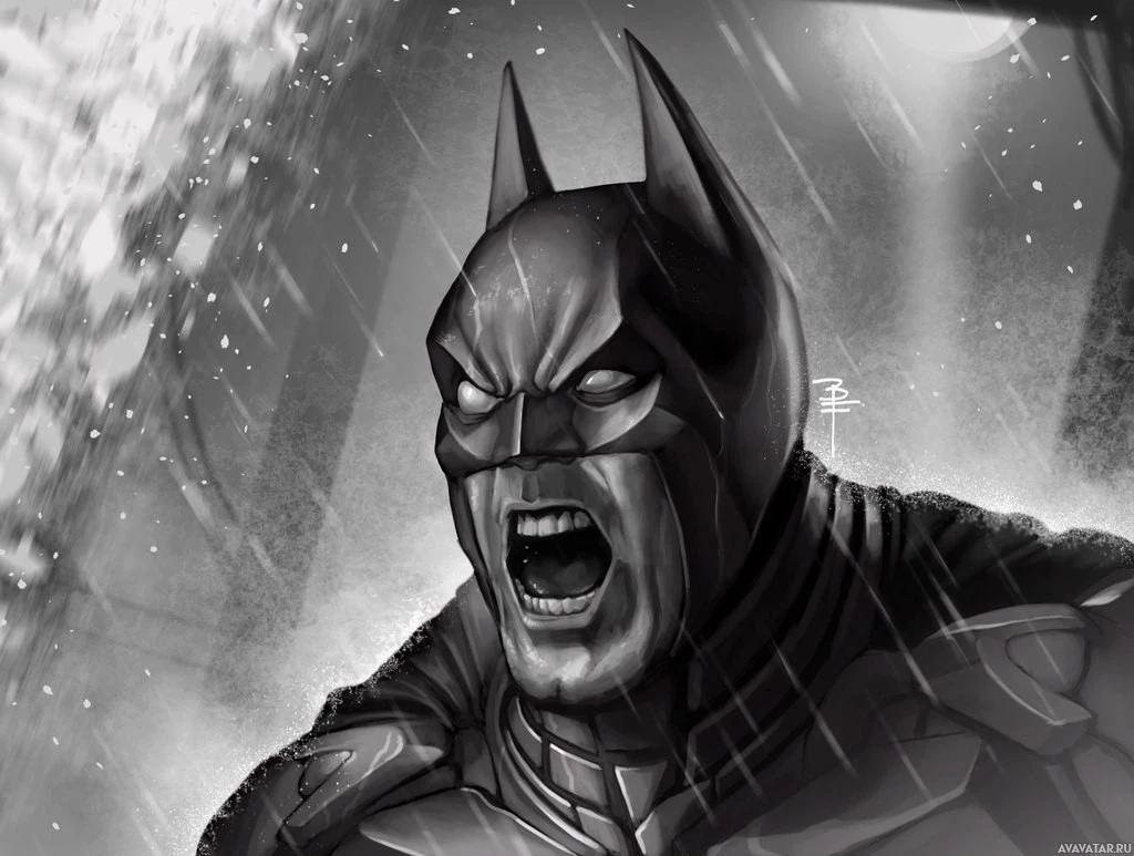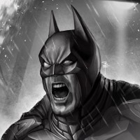 emblem on the chest, which are elements that make up the classic Batman look. The background suggests a dark, possibly stormy night, enhancing