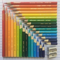 a piece of paper. Each pencil has a unique color and brand logo printed on it, indicating they are likely from different manufacturers. The colors range from red to yellow, green, blue, purple, orange, pink, brown, and other shades, reflecting the variety of hues available in these