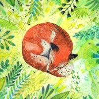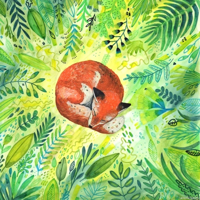 На картине изображена красная лиса, уложенная среди зеленой листвы. Изображение выполнено в художественном стиле с изображением лисы в профиль и окружено различными видами растений и листьев.