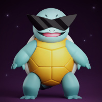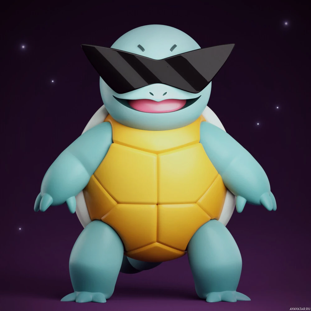 animated character of Squirtle, a well-known Pokémon from the Pokémon franchise. This character is known for its blue skin and yellow shell, which are typical features of Squirtle's appearance in the games and