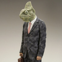 a business suit with the head replaced by a model of a chameleon. The individual is holding a briefcase, and the overall appearance creates an unusual and humorous contrast between