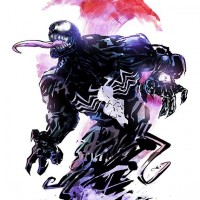 vibrant colors, emphasizing the action and intensity of the scene. Venom appears to be in motion or possibly battling another character, given