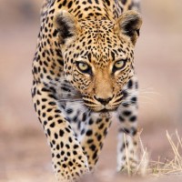 На картине изображен леопард, который является животным, известным своими отличительными розетчатыми отметинами на шерсти. Похоже, что он идет или бежит по тому, что кажется сухим пастбищем с редкой растительностью на заднем плане.