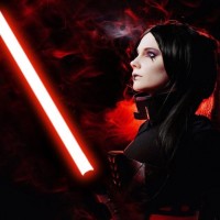 На картинке изображена женщина с темными волосами, держащая световой меч, который является знаковым оружием из франшизы «Звездные войны». У нее суровое выражение лица и одежда, которая может указывать на то, что она может быть персонажем из вселенной Звездных войн. Фон имеет красноватый оттенок с дымом или туманом, добавляя драматический эффект к изображению.