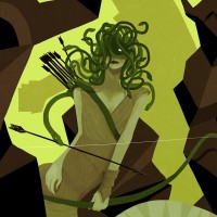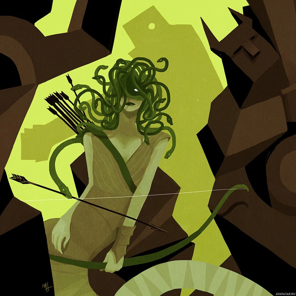 Greek mythology. She is portrayed holding a bow and arrow, which suggests she may be characterized as a huntress or archer in this interpretation. Her head features the iconic snake-haired motif often associated with the character in
