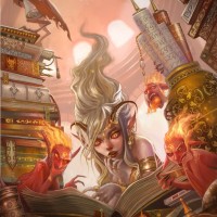 various books and objects that suggest magic or alchemy, including what appear to be potions or vials with glowing elements. There are also small creatures resembling imps or demons playing around the main figure, adding to