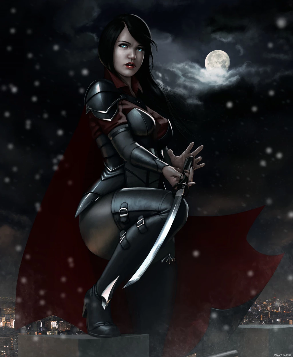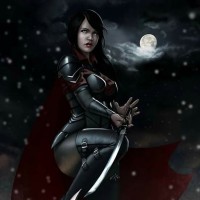a full moon. Her pose is confident and assertive, which might indicate that she is a warrior or