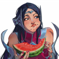 slice of watermelon in her hand and taking a bite out of it. The overall style suggests that this image could be