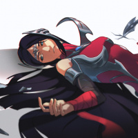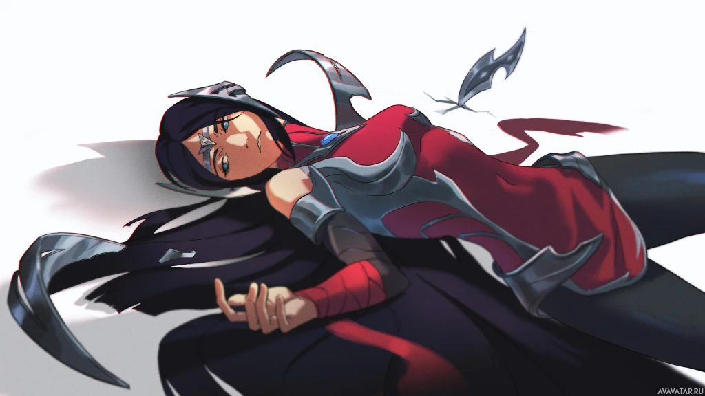 the video game League of Legends. She is depicted with a dark, somewhat gothic theme in her outfit and has features such as large wings or feathers on her shoulders, suggesting she may have an avian motif associated with her