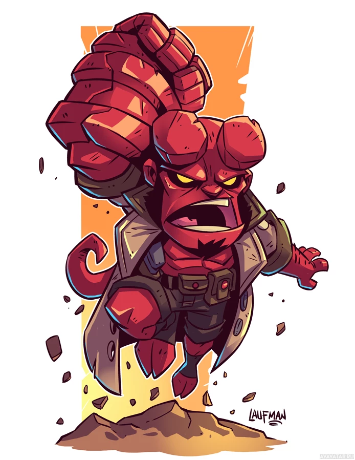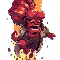 The image shows an illustration of a character that resembles Hellboy, a comic