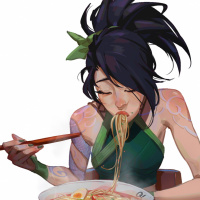 closed eyes indicate she might be enjoying the taste or aroma of the food. This character resembles Akali from the game "League of Legends," known for her fighting style and as an assassin character in the game.