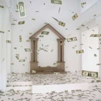 The image shows a room with money scattered around it. There are numerous bills and coins of