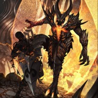 dark armor and carrying a sword, possibly representing a warrior or guardian figure. On the right side of the frame stands a creature that appears to be a demon with horns and
