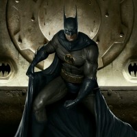 iconic costume, which includes a bat-themed cowl and cape, with the emblem of a bat on the chest area. Batman is positioned against a backdrop that appears to be an industrial or mechanically themed setting, suggesting a scene from his adventures in