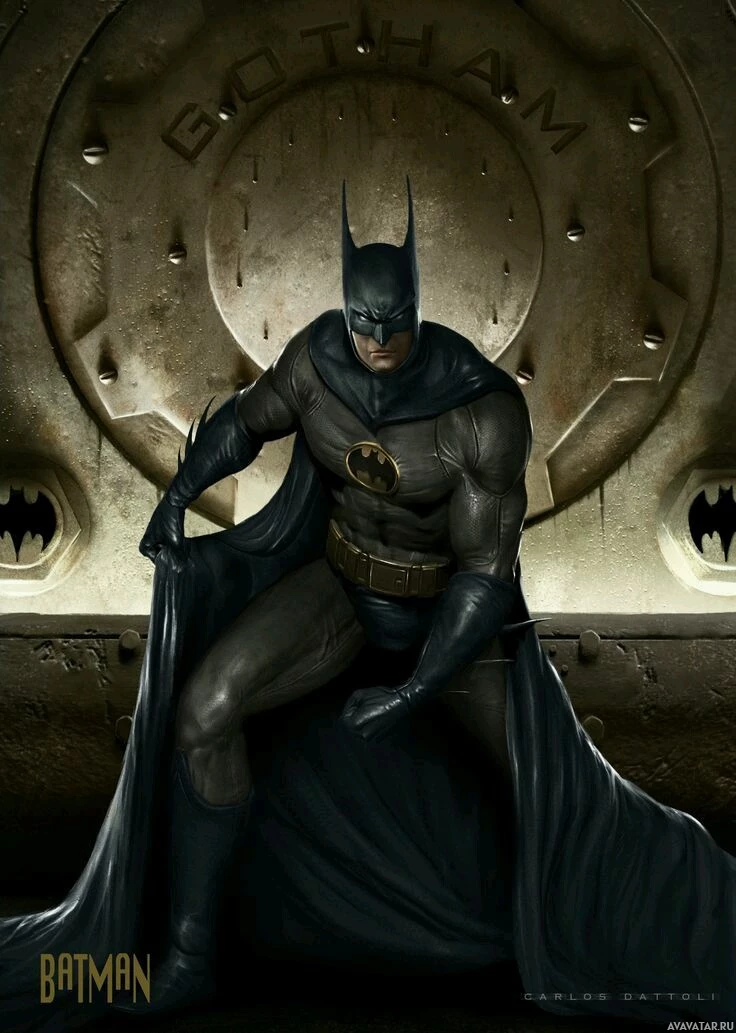 a confident stance, holding what looks like a utility belt, which is a signature accessory of the character used for various gadgets and equipment.