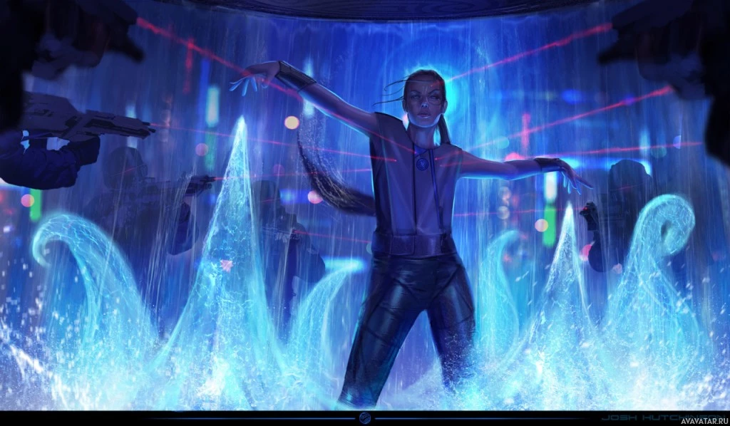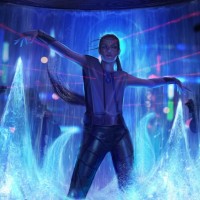 long hair that is flowing behind her. The background features vibrant blue and green lights that could indicate