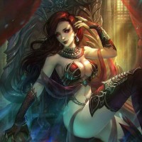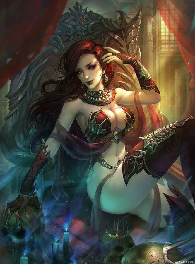 red hair and the throne she's sitting on. The setting seems mystical or otherworldly, with a gothic design element like a skull at her feet.