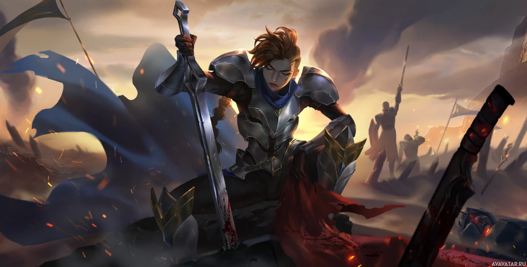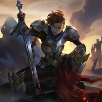 League of Legends." This is an illustration rather than a photograph. The character appears to be male, wearing armor and holding a sword. He has