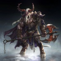 fierce expression and menacing presence. He is holding an axe in his right hand, suggesting that he is a warrior or fighter. The armor and accoutrements suggest that he might be of