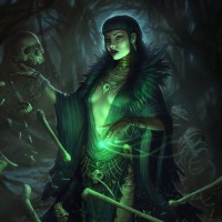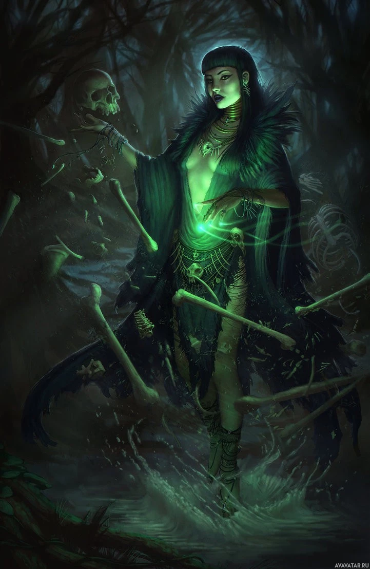 dark hair and is dressed in what appears to be a mystical or supernatural attire, with elements that suggest she might be a witch or someone with magical abilities. In her hand, she holds a staff topped with a glowing