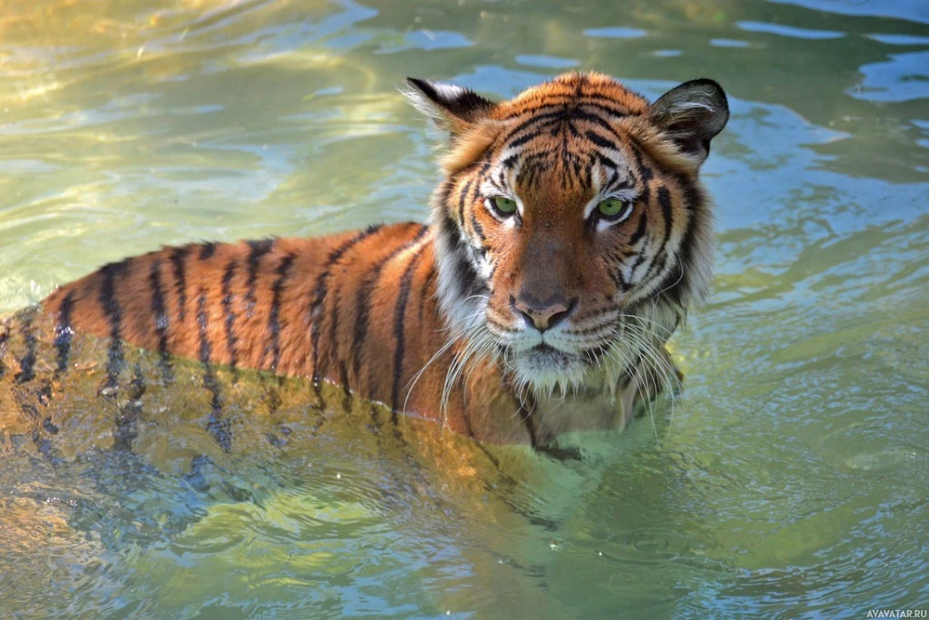 На картинке изображен тигр, плавающий в воде. По-видимому, он находится в естественной среде обитания, вероятно, в реке или водопое, где тигр охлаждается или ищет пищу.