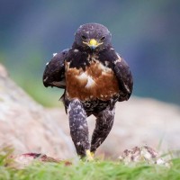 На снимке изображена птица с коричневым и белым оперением, которая выглядит как взрослый сокол-перегрин. Это ходьба по тому, что выглядит как травянистая или скалистая местность. У птицы острый клюв и когти, характерные для соколов, и она смотрит вперед во время ходьбы.