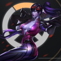 The image shows a character from the video game "Overwatch," specifically, Widowmaker. She is depicted with her iconic appearance, wearing purple and pink attire, with a sniper rifle in hand.