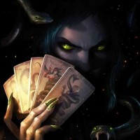 The image features a fantasy-themed character who appears to be inspired by the mythological figure Medusa, a Gorgon known for her snake-like hair. This character is depicted holding playing cards and looking over them with an intense expression, possibly suggesting a connection between cards and fate or destiny. The background has a dark and mysterious atmosphere, fitting the fantasy genre.